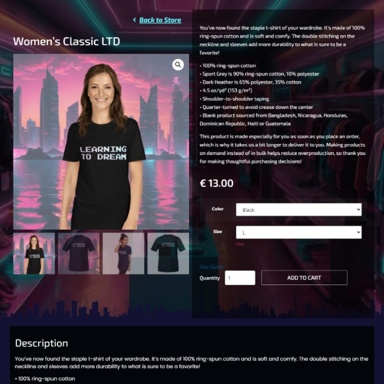 Ce site intégre WooCommerce, directement relié à la plateforme Printful. Ceci permet de proposer du merchandising de qualité et produit à la demande, évitant de ce fait la gestion de stocks tout en réduisant l’empreinte carbone grâce aux divers ateliers d’impression répartis dans le monde.